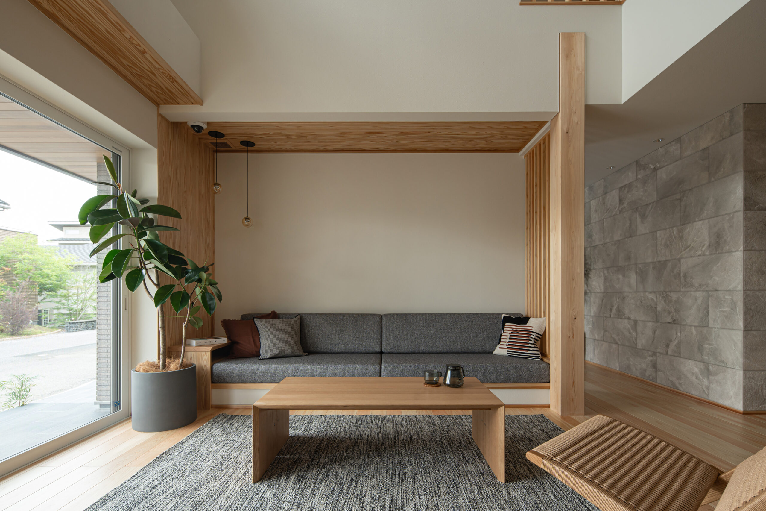 リビングに造作ソファ。サイズに合わせて別注クッションを納めました。