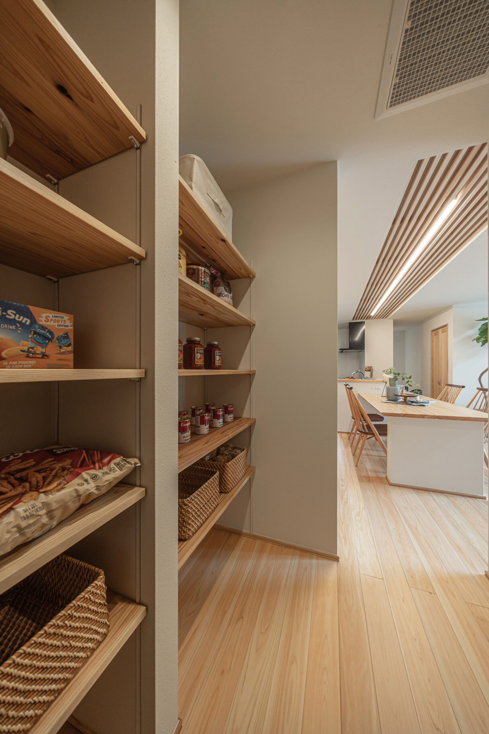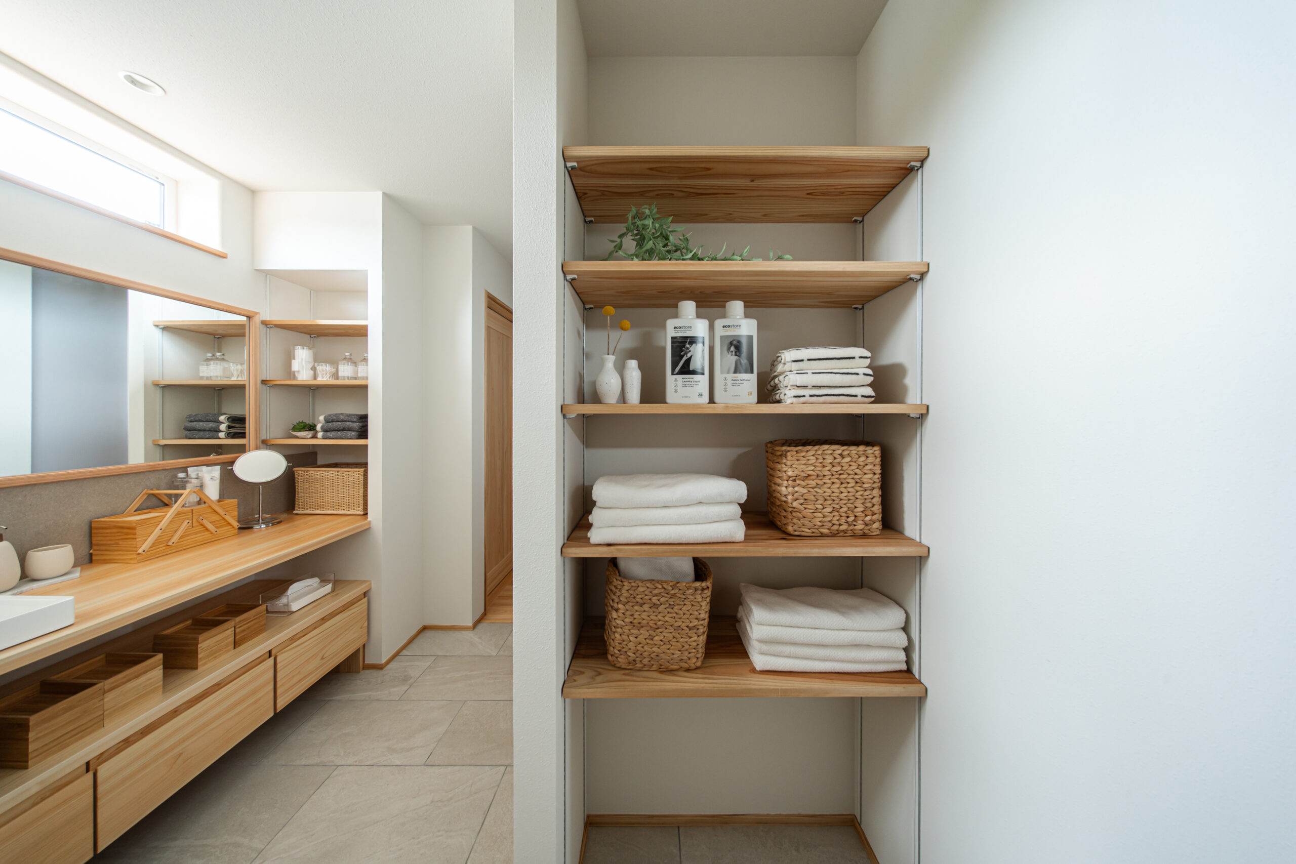家具以外もパントリーの生活雑貨。洗面スペースの可動棚。ウォークインクロゼットの衣料品まで。