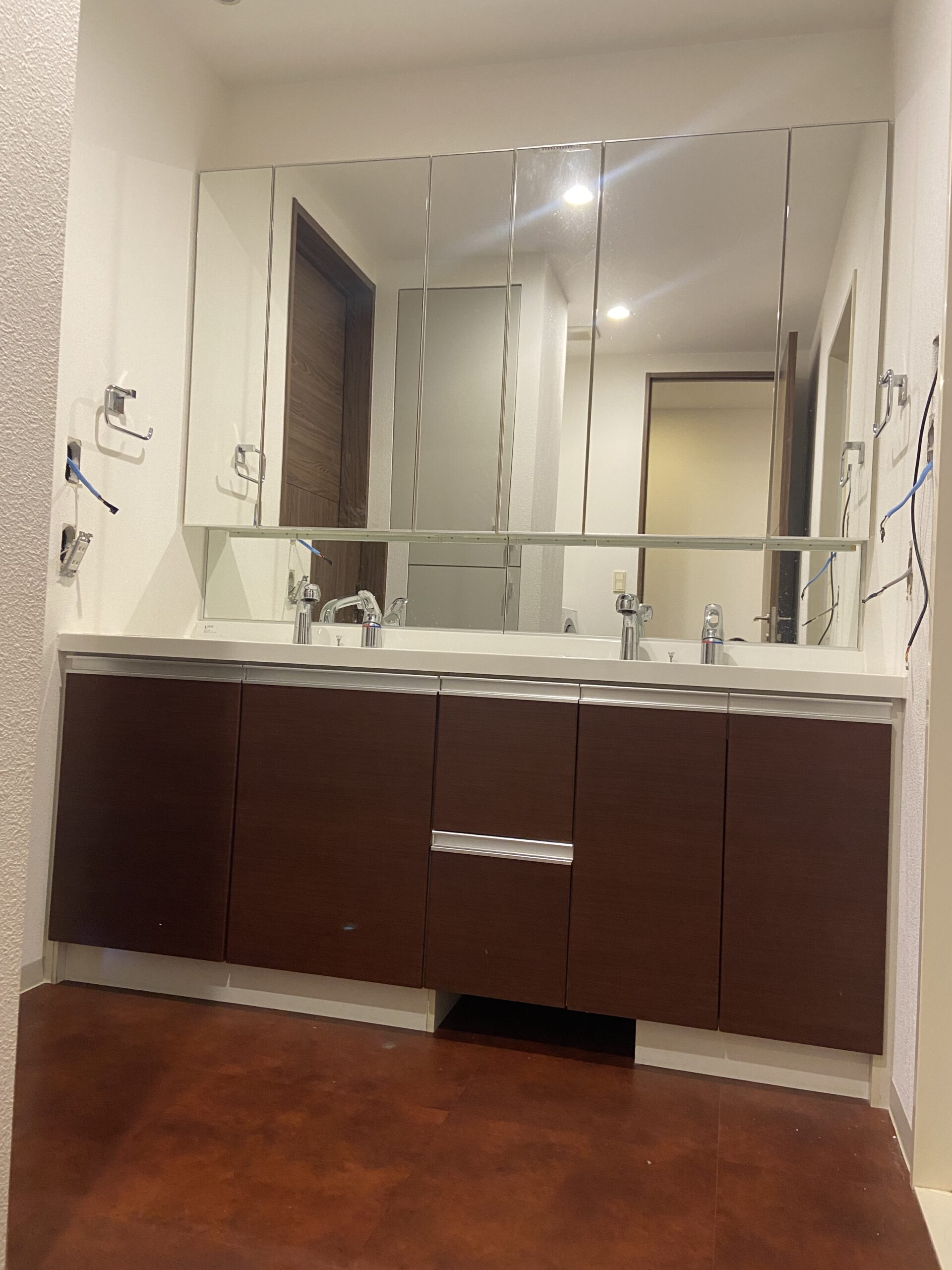 床材も本来であれば無垢材のヘリンボーンにしたかったのですが、水回りという事で塩ビタイルで施工させていただきました。