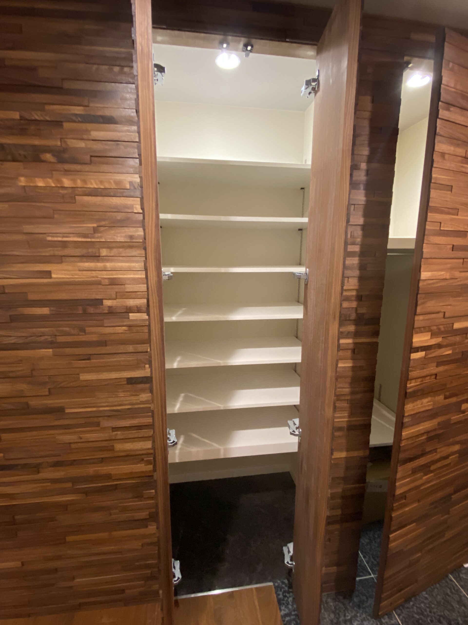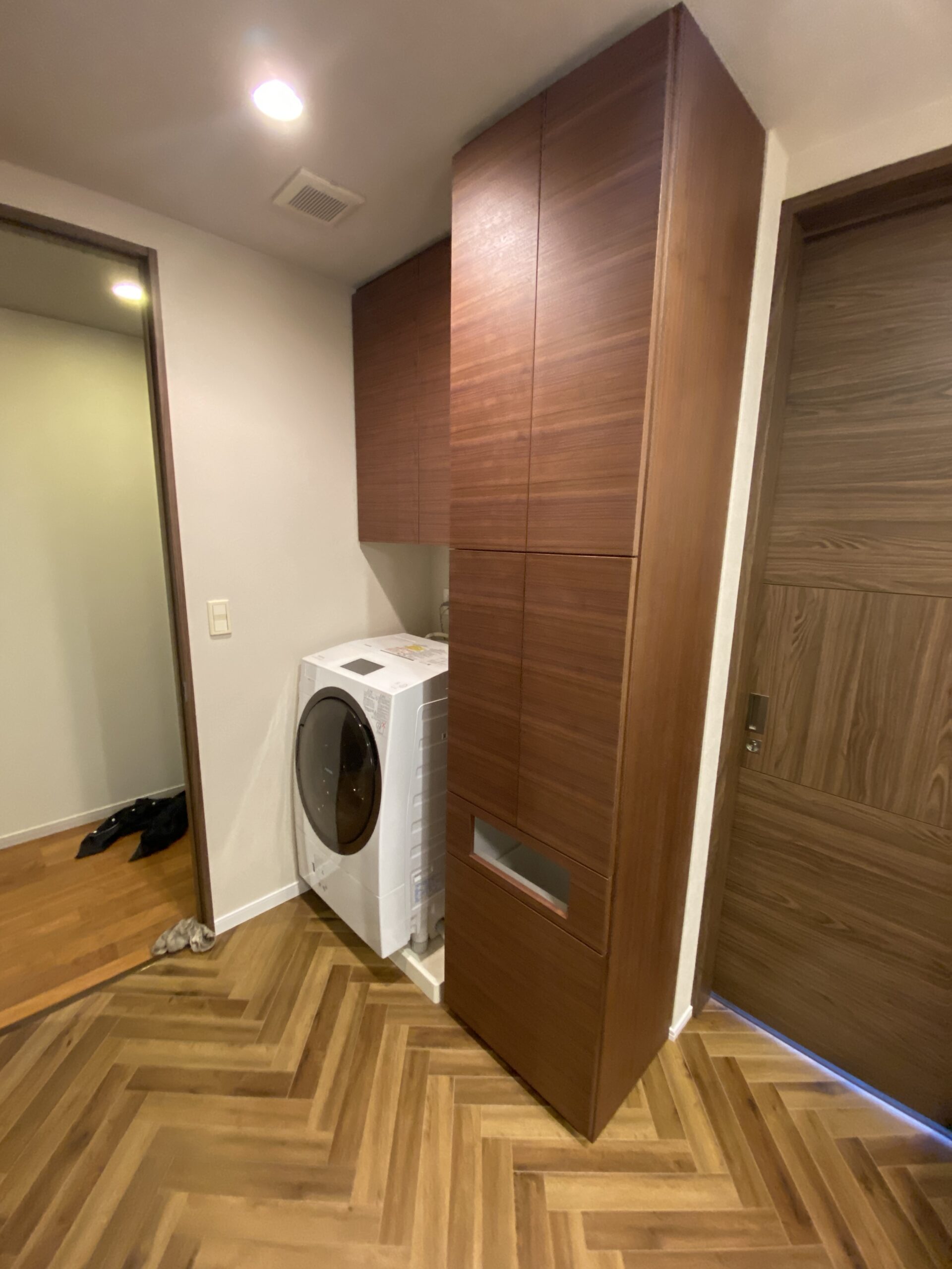 洗濯機の隣もウォールナットの突板の造作家具です。