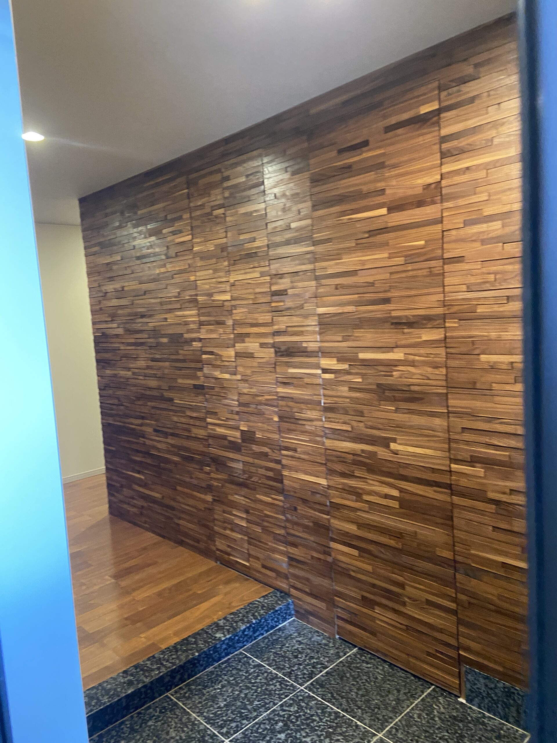 こちらは玄関を入って正面の壁ですが、マスターウォールのモールドタイルを一面に貼りました。