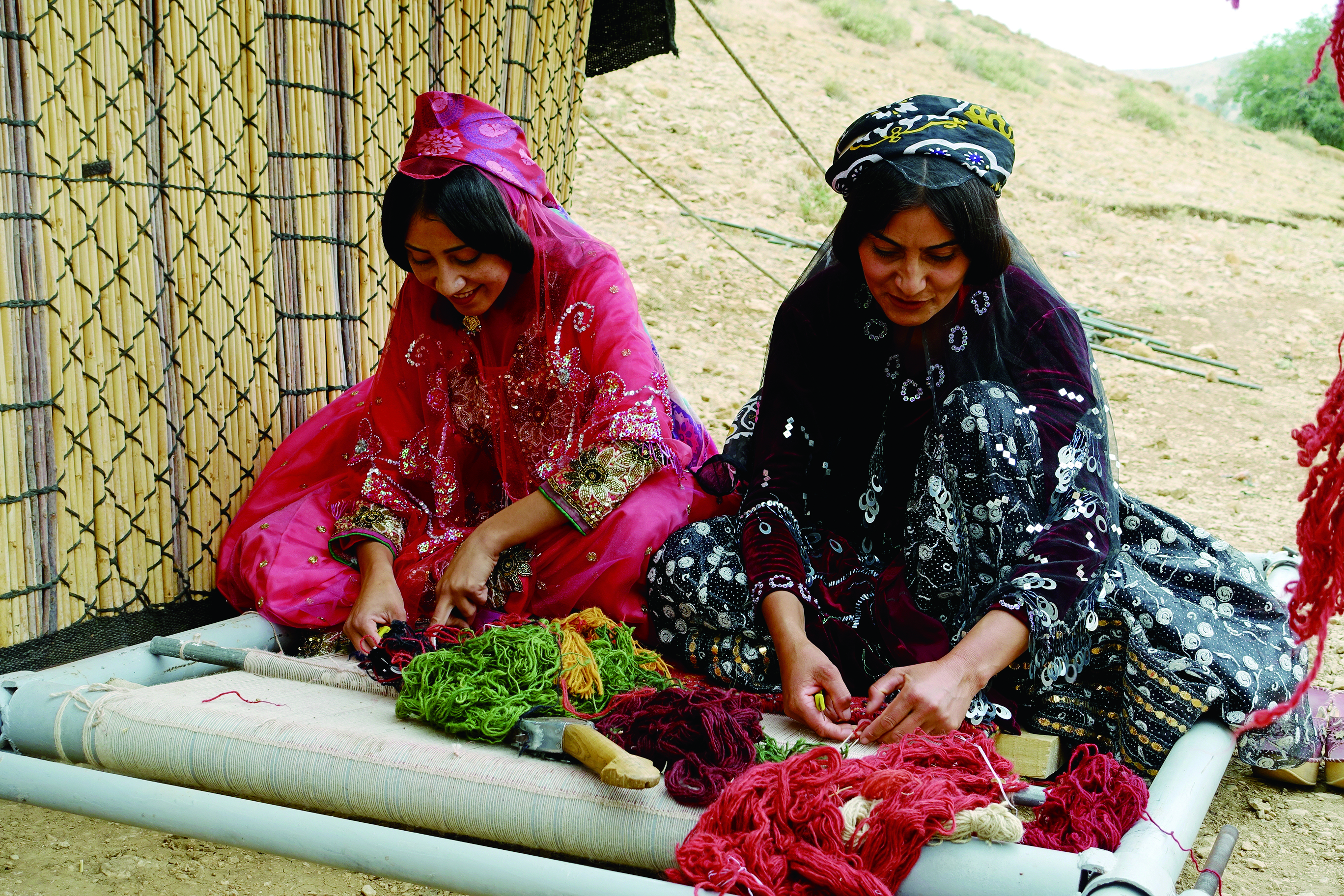 カシュガイの女性たちは遊牧生活の中、家事や育児の合間にギャッベを織ります。